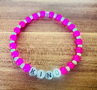 STRETCHABLE AND MEASURES AT 6 INCHES. DARK PINK BEADS ACCENTED WITH SMALL NEON GREEN BEADS. NOT RECOMMENDED FORFOR XL WRIST SIZES.